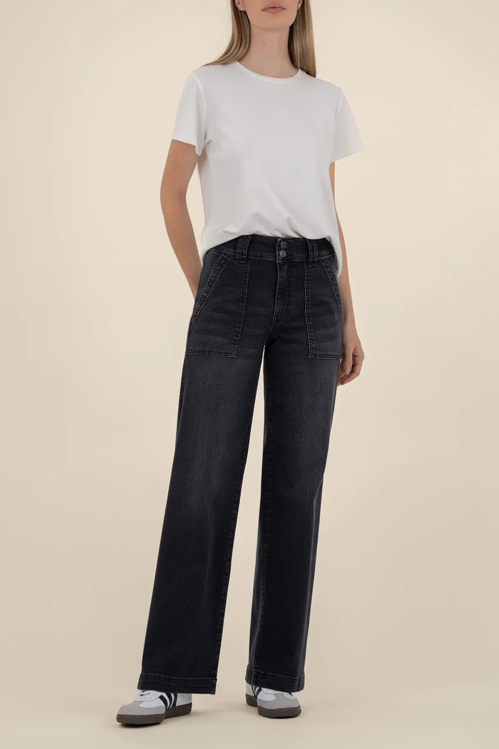 Discover the perfect blend of style and comfort with these high-rise straight leg jeans in a sleek black wash. Featuring unique porkchop pockets, double belt loops, and stylish double front buttons, they’re crafted from very stretchy fabric for a flattering fit that moves with you all day long.