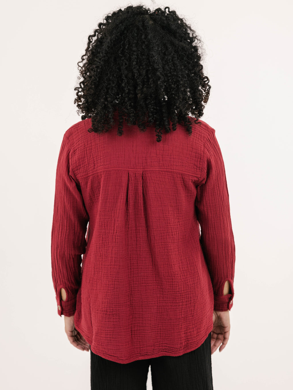 Our Cotton Gauze fabric is made of soft 100% natural cotton fibers, that make it breathable, hypoallergenic and light-weight. It is woven using a special technique that involves twisting horizontal warp threads around the vertical weft threads, resulting in a soft, crinkled, and loosely-woven texture with a slight vertical stretch. We focus on having minimal environmental impact by carefully selecting materials like this Cotton Gauze, as it is a wonderful long-lasting material and local to our artisan maker’s region.
