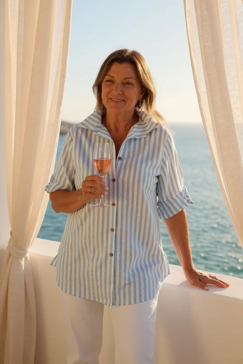 It is incredibly versatile and easy to style; pair it with crisp white trousers for a refined look perfect for sipping wine on the terrace as shown, or tuck it into denim shorts for a casual day of sightseeing. Whether buttoned up for a dinner by the sea or worn open as a light layer, this shirt is the ultimate travel staple for effortless elegance.