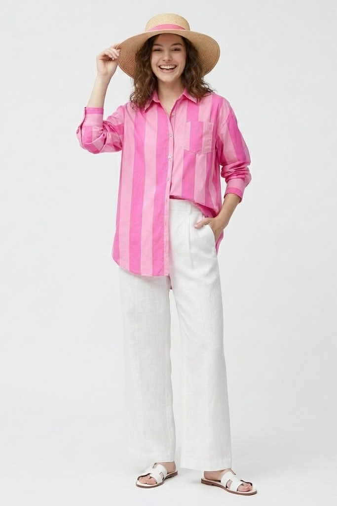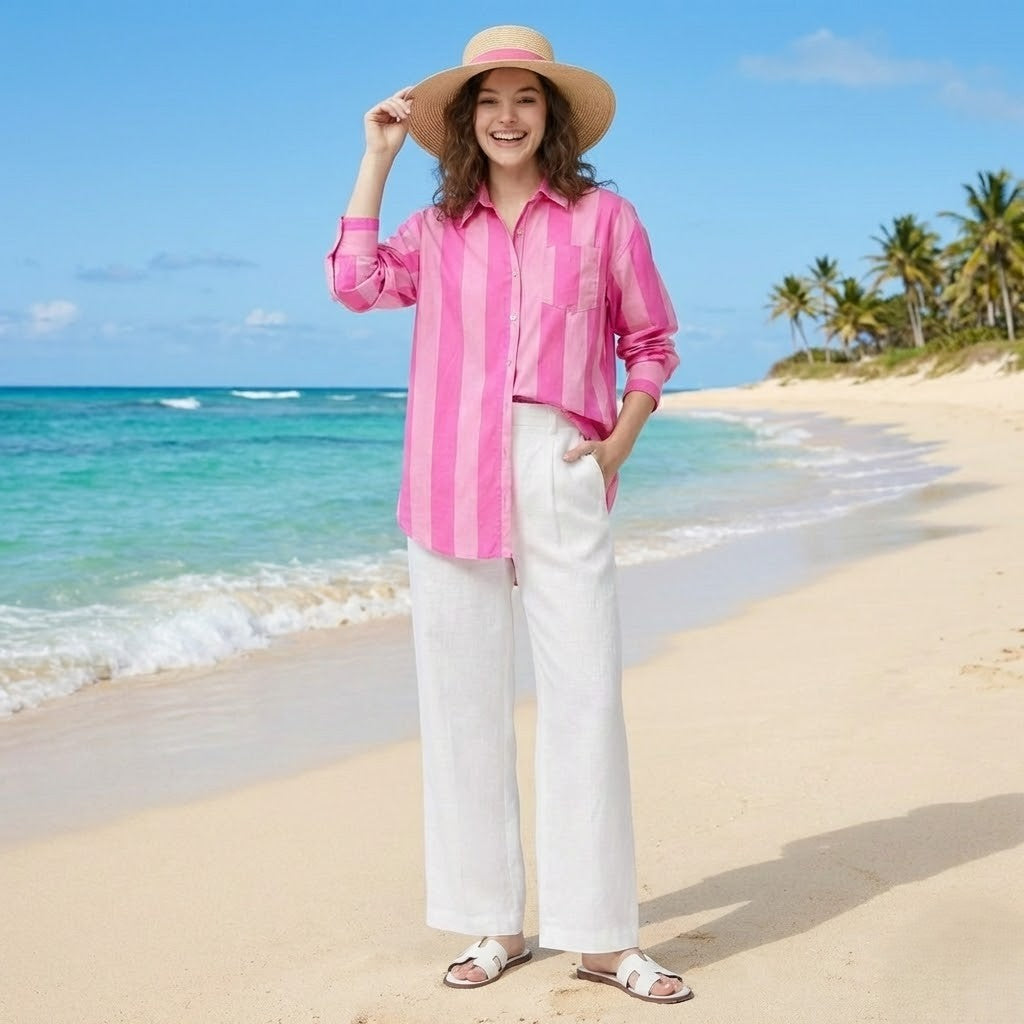 The Dawn striped button-up is a chic and versatile piece for any wardrobe. Its bold vertical stripes create a modern and eye-catching look, while the classic collared design, long sleeves with cuffs, and single chest pocket add timeless appeal. The shirt is incredibly easy to style; it looks effortless when worn loosely over white wide-leg linen pants for a relaxed, breezy feel. Paired with simple slide sandals and a wide-brimmed straw hat, it creates an instantly stylish and sophisticated summer-ready outfit with minimal effort.
