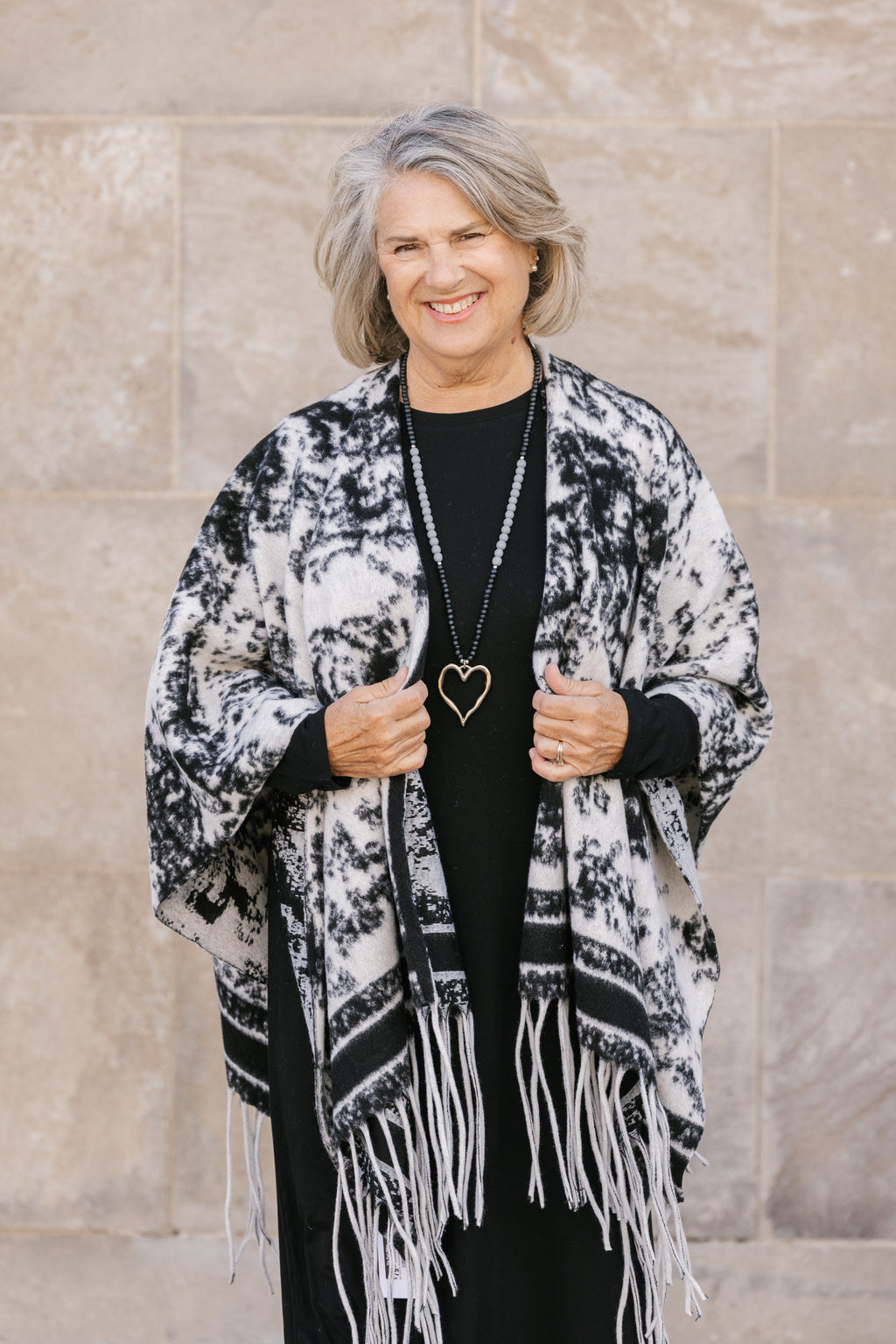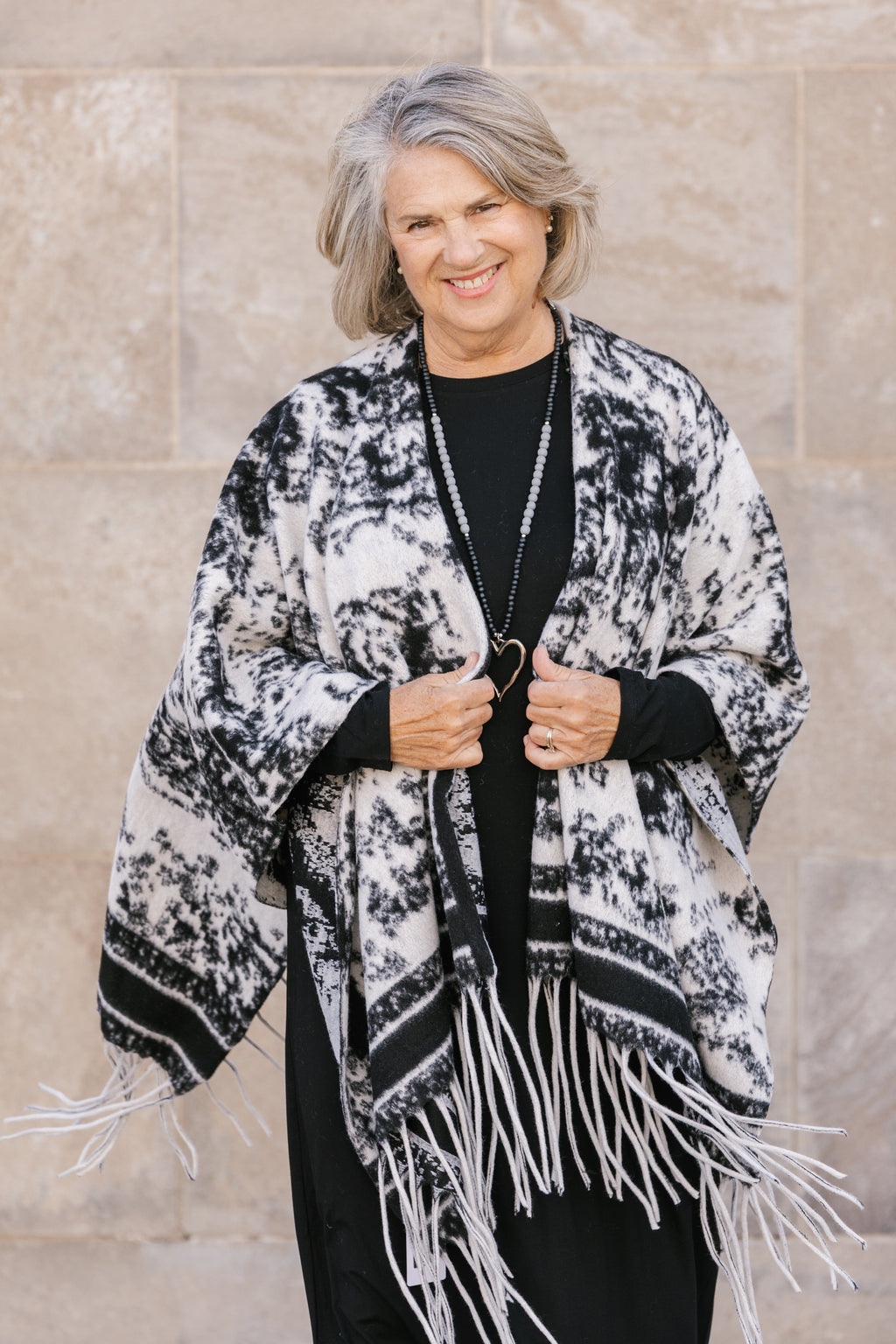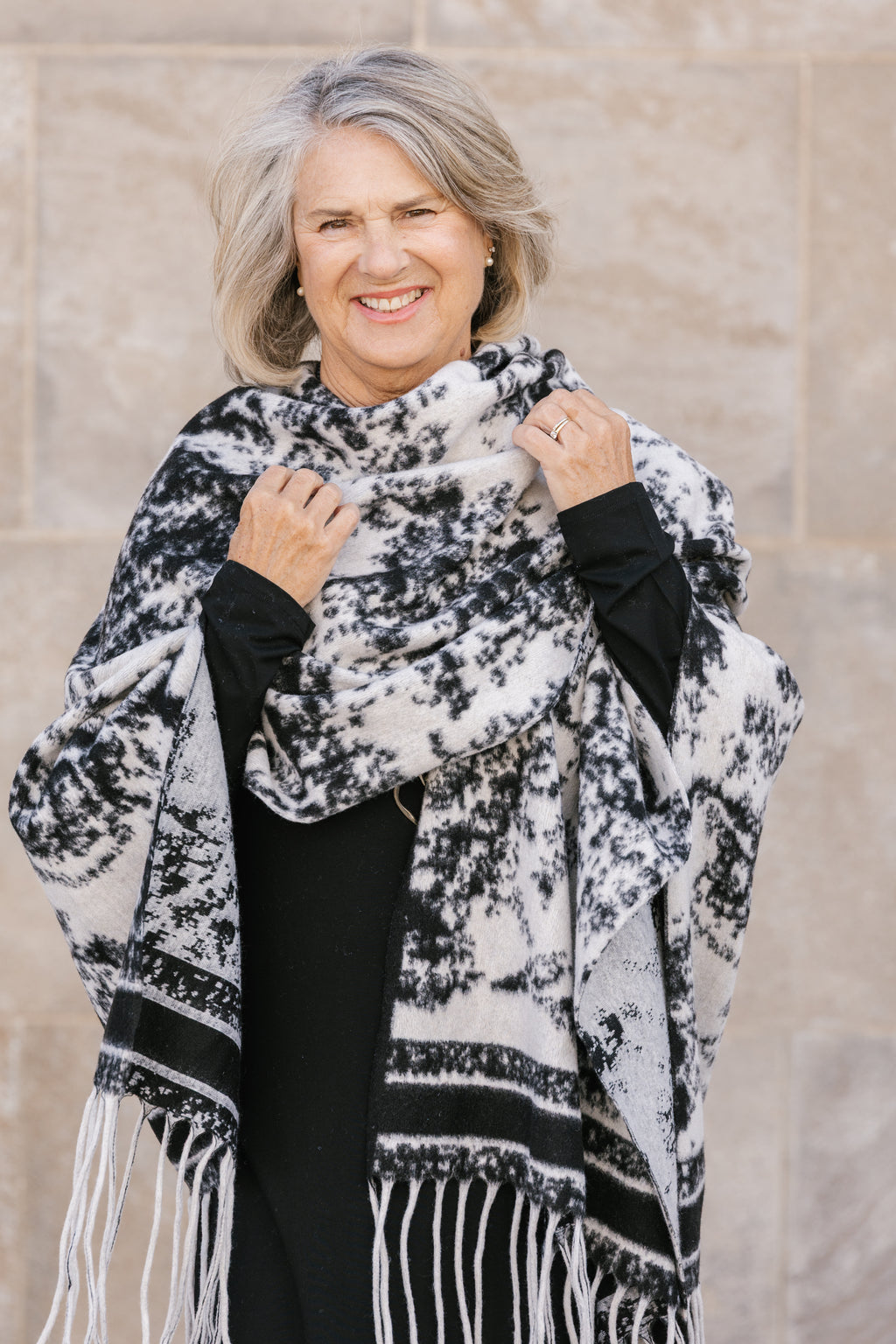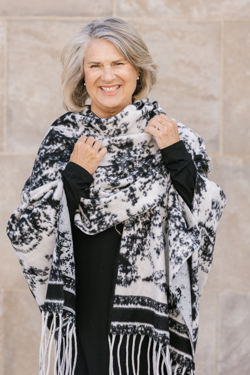 Wrap yourself in modern elegance with this stylish wrap featuring a dynamic black and white speckle pattern. The design creates a striking contrast, with scattered specks that mimic paint splatter or abstract snowfall, giving the piece an artistic, contemporary feel. Whether draped over the shoulders or styled as an accent piece, this wrap adds visual texture and monochrome sophistication to any outfit. Lightweight yet cozy, it's perfect for layering year-round.