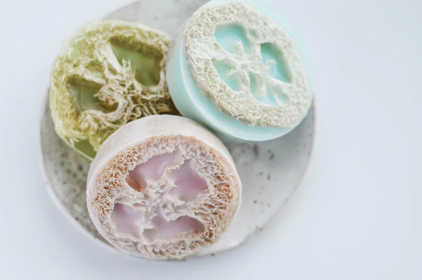 Scrub and Suds Combo - Harmony slices natural loofahs like they are big baguettes and stuff those babies into molds where they get filled to the brim! Just like a sponge, the loofah sops up loads of liquid soap so trust us... this bar goes on forever! Great for exfoliating and even better for extra dirty parts!