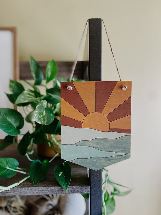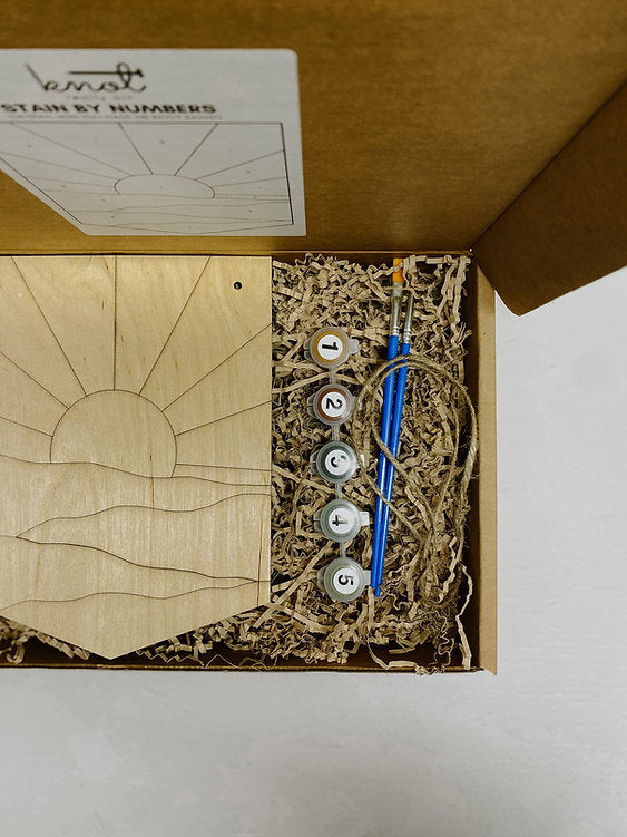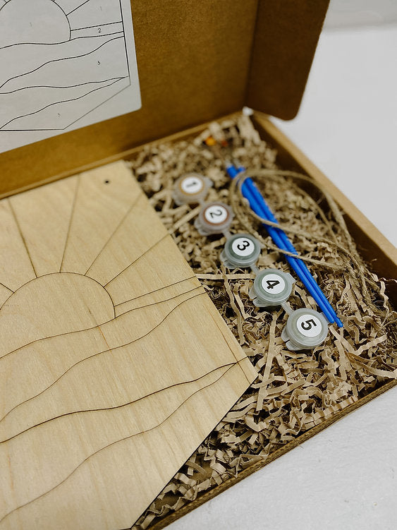 Step back in time with our Vintage Sunset Stain by Numbers Kit, creating a serene sunset scene on a wooden backdrop.
