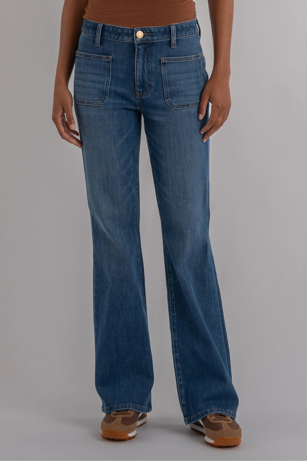 Retro revival meets modern chic, KUT from the Kloth™ Ana High-rise Flare With Patch Pockets Regular Hem. Designed with a regular fit and a flared leg that kicks just below the knee, this pair brings back that iconic 70s silhouette, reimagined for today's trendsetters. The high-rise waist flatters your figure, while the zip-fly with button closure, five-pocket design, and belt loops add everyday functionality. Ideal for taller figures, these jeans hug your legs in all the right places, creating an effortlessly elongating look.