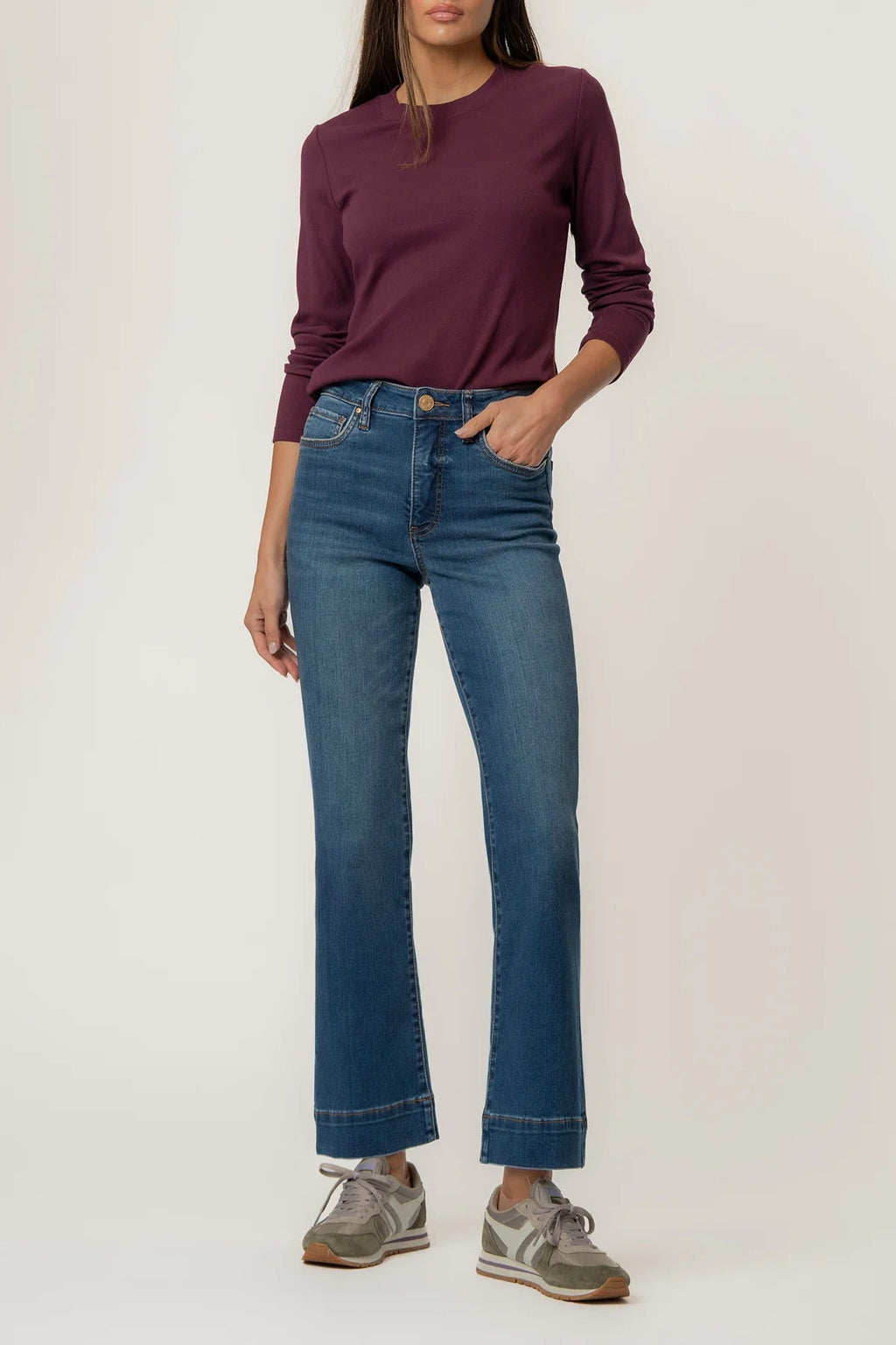 - Flatter your shape and elevate your style with these high rise ankle flare jeans, crafted in a rich dark wash with a bold wide hem for a standout finish. Built-in Fab Ab pockets smooth and support, while the stretchy material ensures all-day comfort with a structured feel.