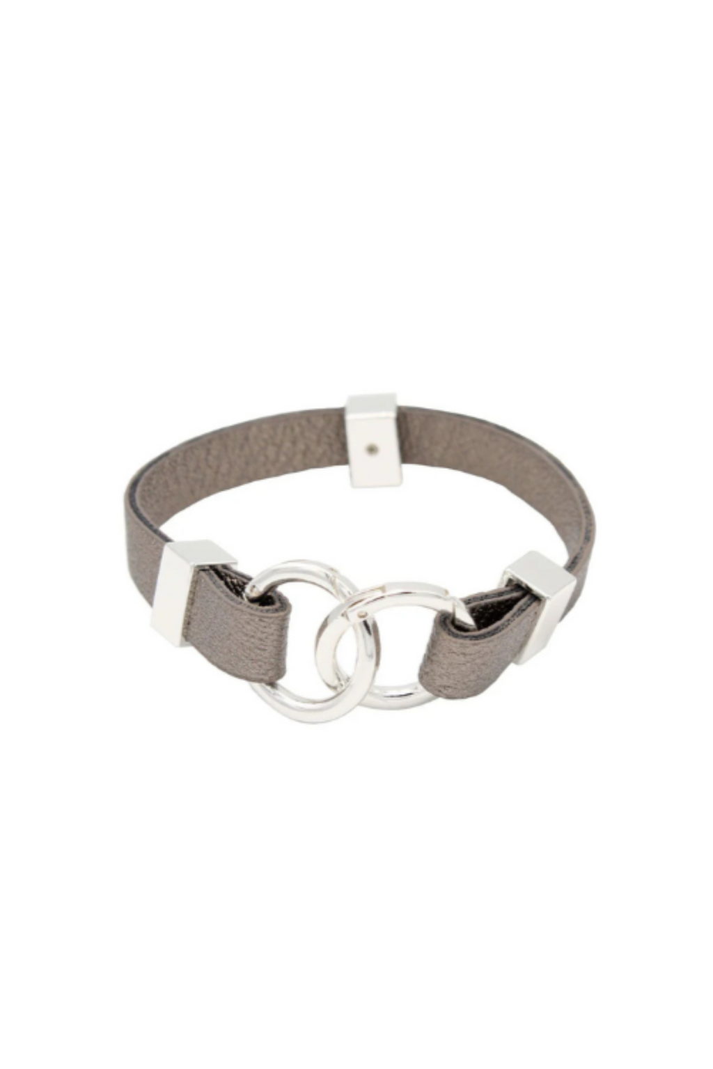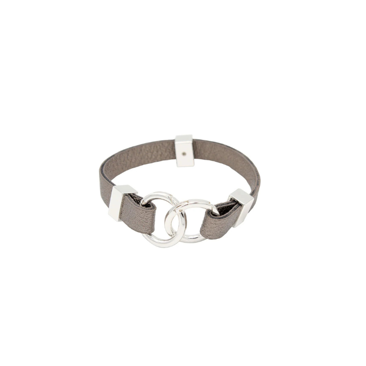 The Metallica bracelet is crafted from high-quality faux leather in a sleek ½-inch width, offering a bold yet streamlined look. Designed with a modern edge, it features silver nugget detailing at both ends and along the back, adding subtle texture and shine. The closure is made of two 1-inch silver hardware pieces that not only enhance its industrial-chic aesthetic but also allow for an adjustable fit. Designed to comfortably suit wrist sizes of 7, 7.5, and 8 inches, this piece balances style and versatility — perfect for stacking or making a solo statement.