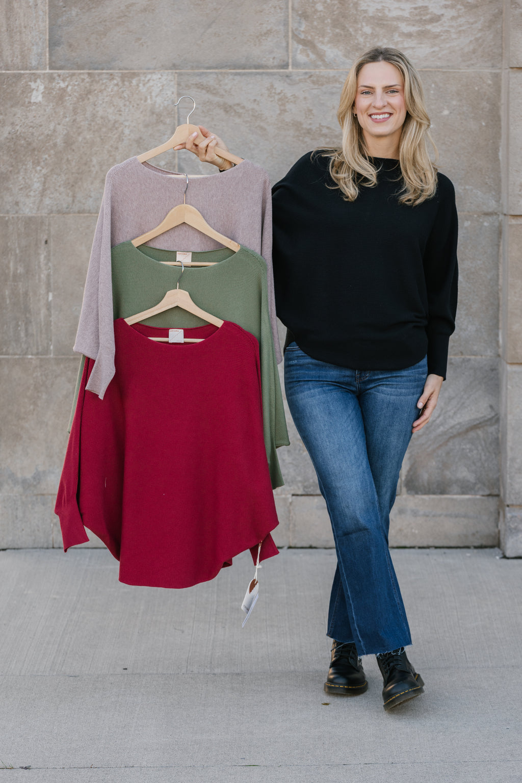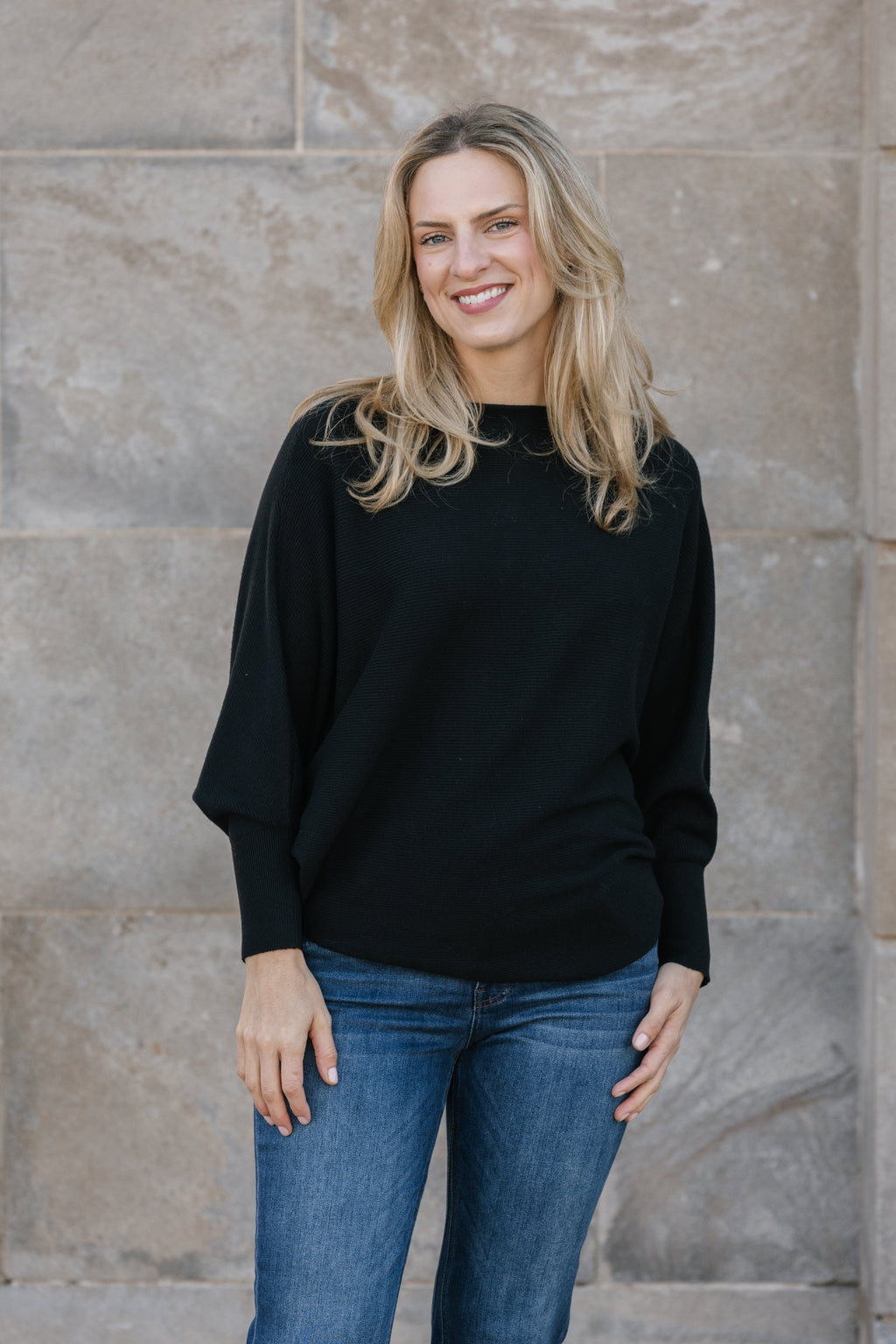 Boat neck top with 3/4 length dolman sleeves and curved sweep in fine rib stitch.