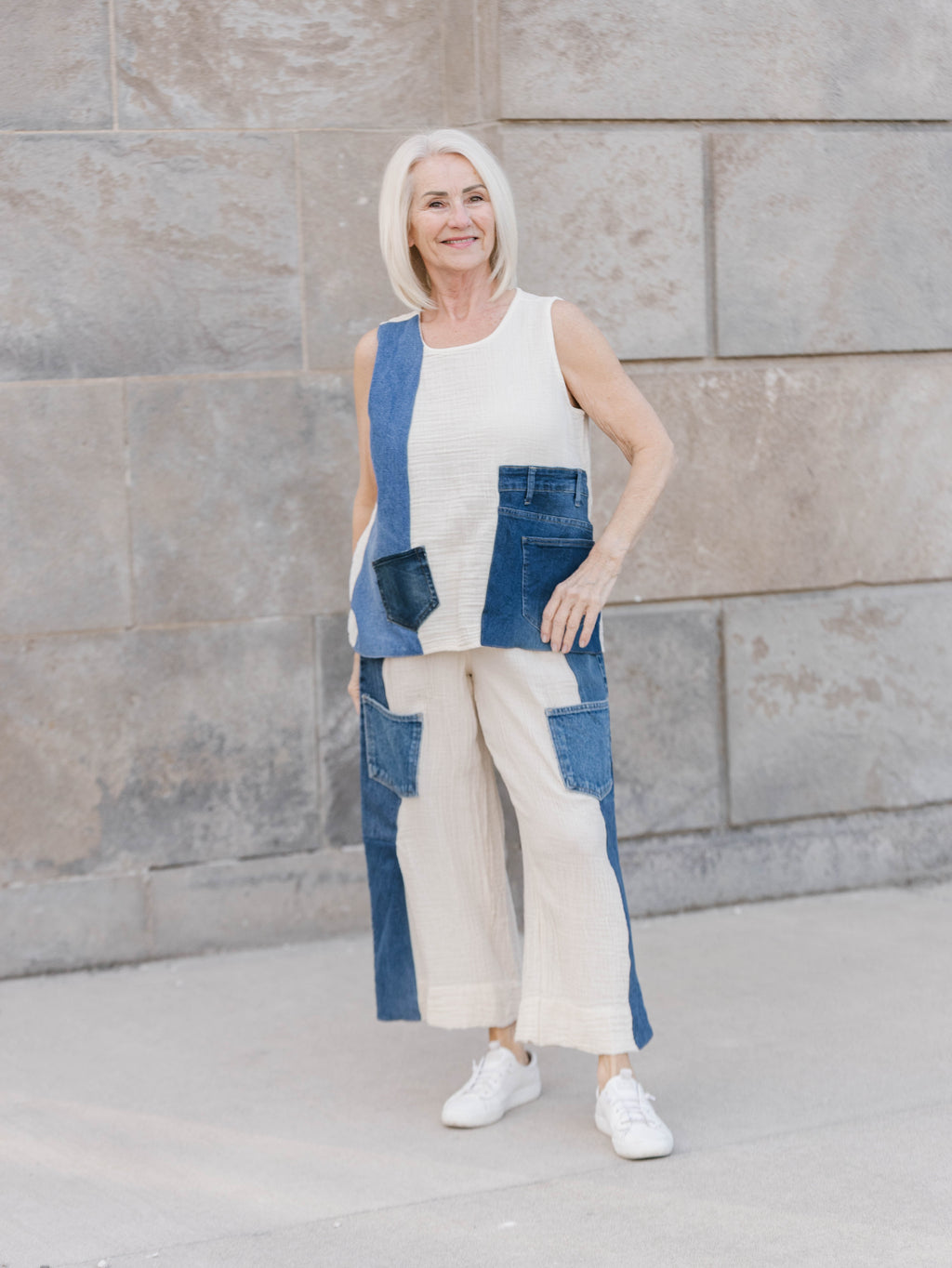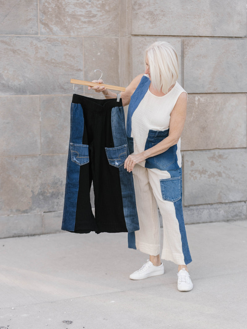 loosely-woven texture with a slight vertical stretch. We focus on having minimal environmental impact by carefully selecting materials like this Cotton Gauze, as it is a wonderful long-lasting material and local to our artisan maker’s region. We upcycled the vintage denim and designed combining deconstructed vintage denim pieces which diverts it from the landfills and gives it new life.