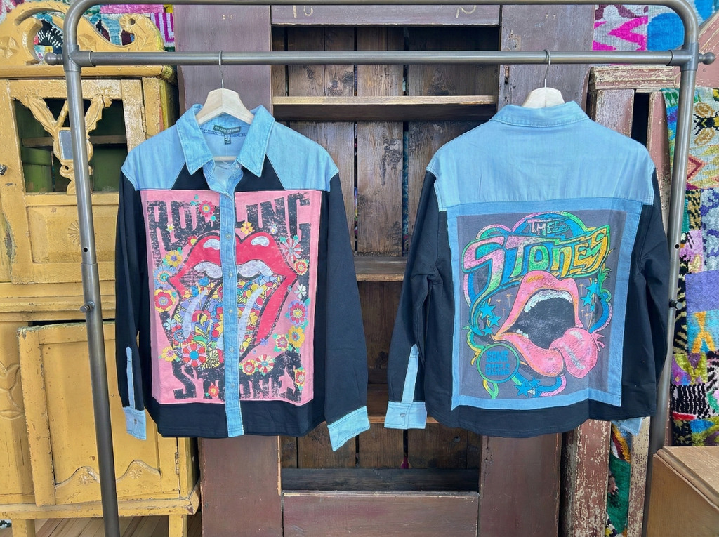 These pieces have been made using upcycled Rock band tees, each piece is one-of-a-kind and designed combining deconstructed vintage denim and upcycled band tees. This diverts it from the landfills and gives it new life.