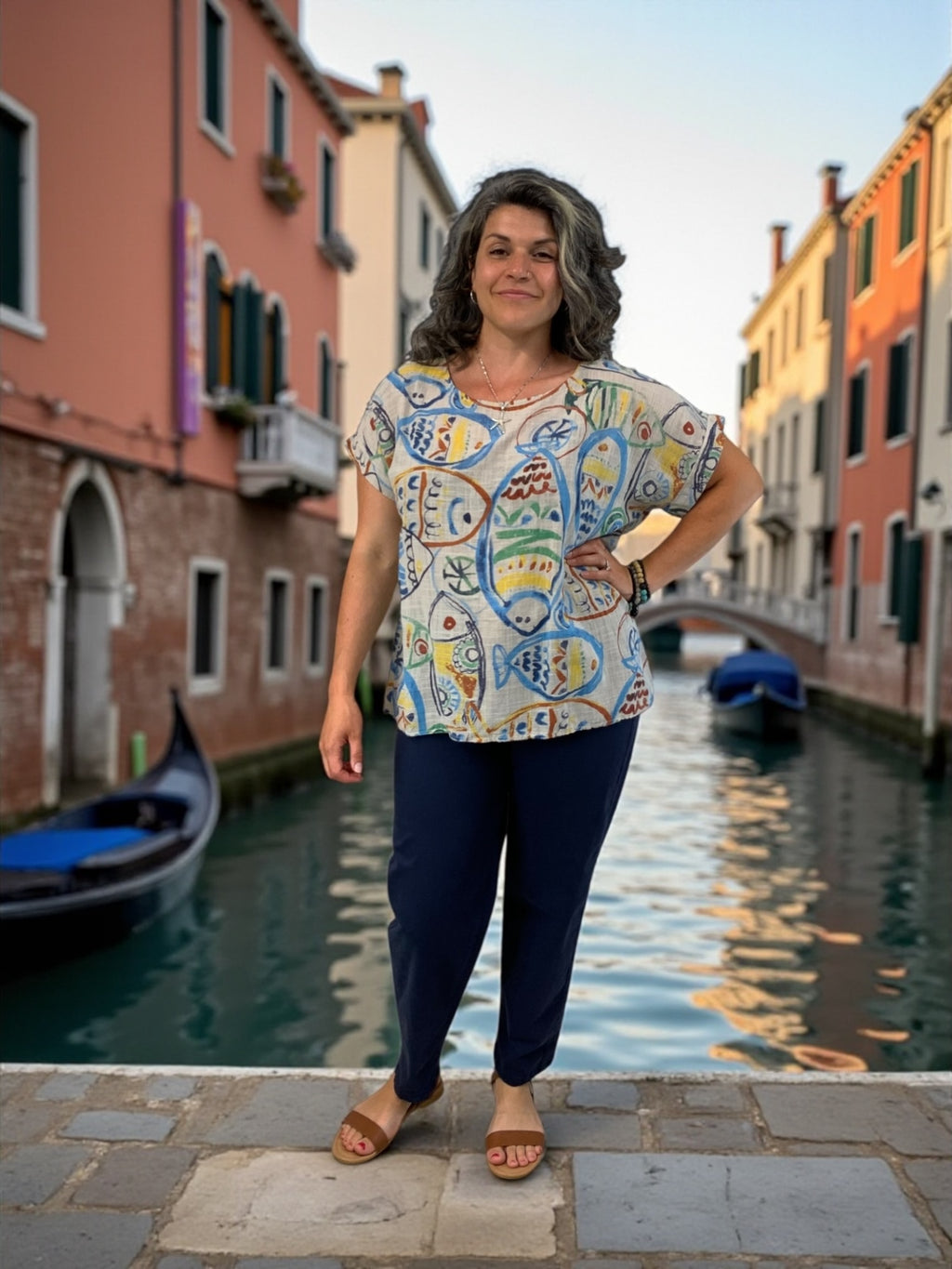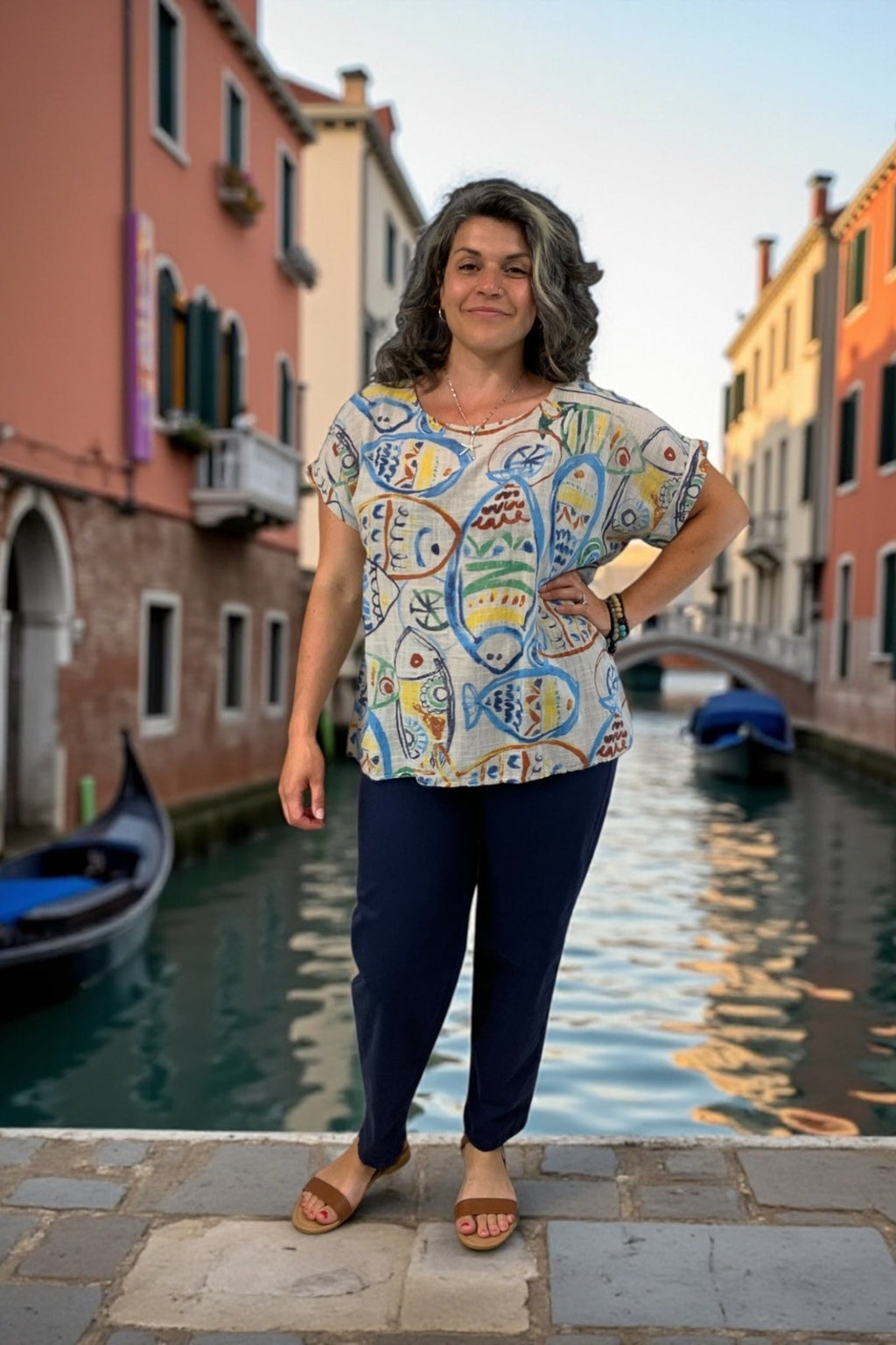 Bring a splash of joy to your spring wardrobe with The Happy Catch Top. This piece is a true conversation starter, featuring a playful, painterly print of colorful fish swimming across a neutral sand-hued background. The artistic motif, with its vibrant pops of blue, yellow, and green, feels like a wearable watercolor painting. Designed with a loose, boxy silhouette and extended cap sleeves, it offers an airy, comfortable fit that is perfect for warm, sunny days by the water.