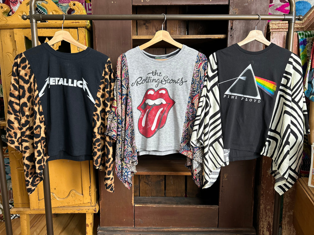 These pieces have been made using upcycled Rock band tees, each piece is one-of-a-kind and designed combining deconstructed vintage denim and upcycled band tees. This diverts it from the landfills and gives it new life.