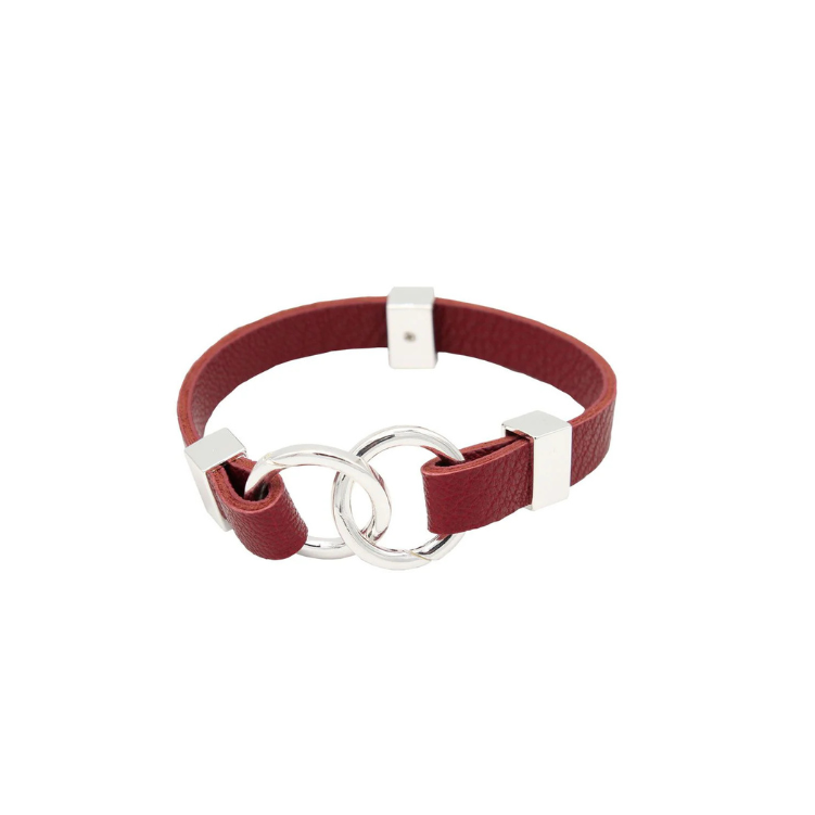 Rich in color and contemporary in style, this bracelet is crafted from smooth, high-quality faux leather in a bold, deep wine hue. Measuring ½ inch wide, this sleek accessory brings an elegant pop of color to your wrist. Each end is adorned with a polished silver nugget accent, offering a refined contrast against the rich tone of the band. A matching two-piece, 1-inch silver HardWear closure at the back adds a modern industrial edge, combining fashion with function.