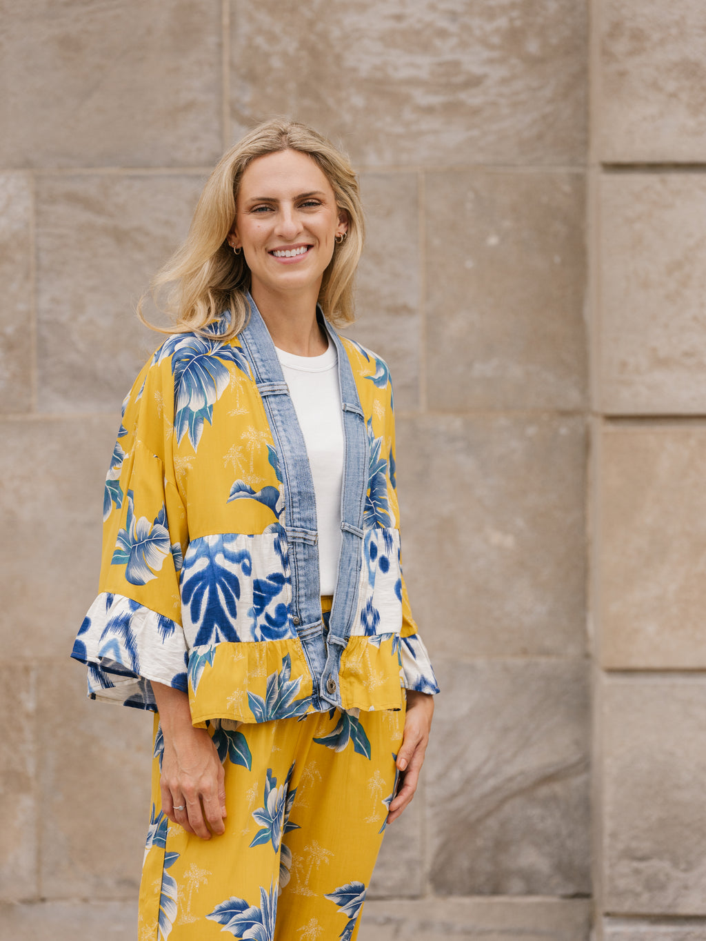 The prints are limited runs to be mindful of limiting our fabric waste. We have combined deconstructed vintage denim and upcycled them into many of the designs, this diverts it from the landfills and gives it new life.