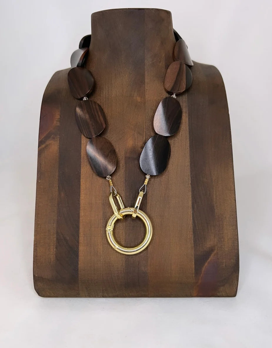 A beautifully versatile piece that complements just about anything. This flexible 21" StrandWear is handcrafted from 35mm Tiger Ebony twisted ovals, showcasing the rich, dark brown tones and natural grain of this dense hardwood found in the Philippines. Each piece highlights the organic beauty and strength of Tiger Ebony, finished with sparkling Swarovski Crystals and elegant Gold HardWear for a touch of refined sophistication.